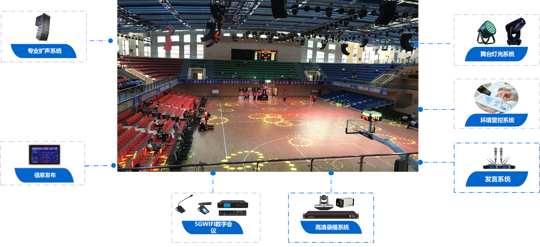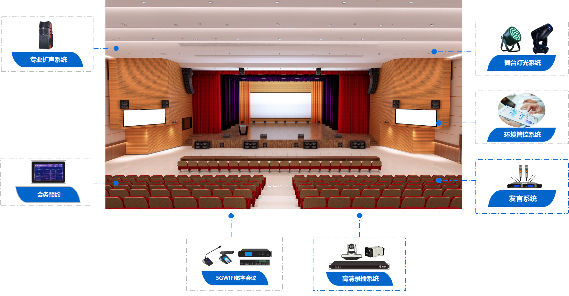 ● 音响扩声系统主要包括节目信号源、信号处理、功放、音箱等内容,通过先进的设计理念及高品质的设备配置,营造完美的音响效果,满足会议室、多功能厅、报告厅的发言、汇报、演讲、讨论等,能达到清晰反馈人声讲话的目的。