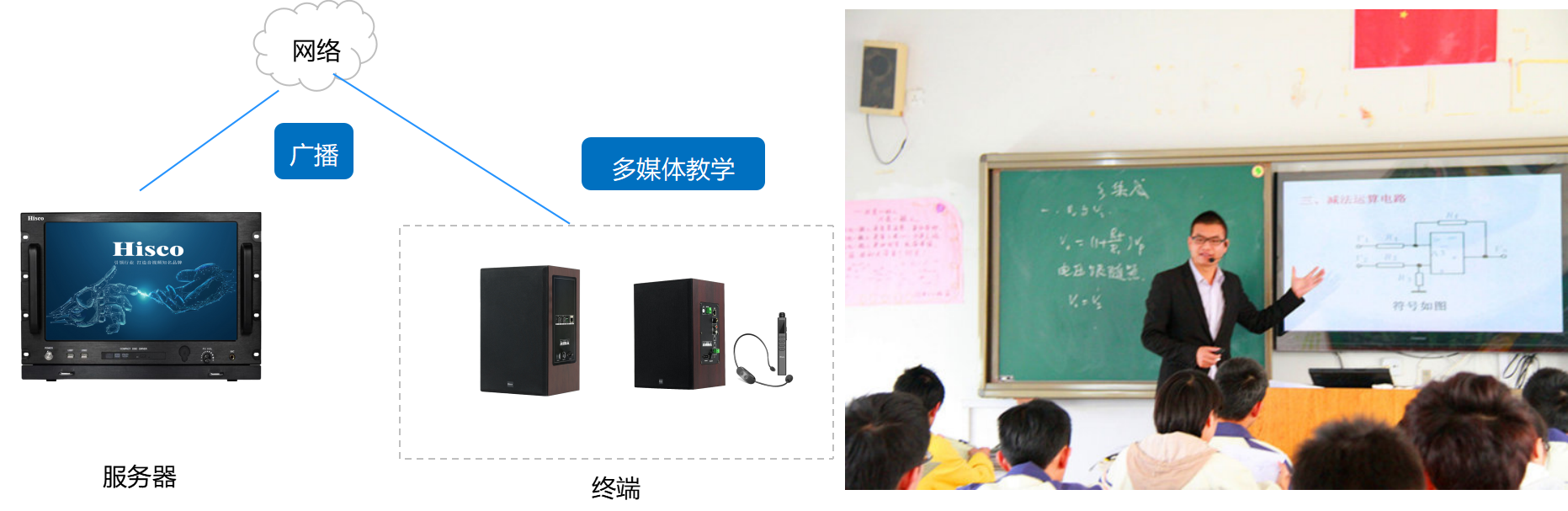 ● 终端有音频线路输入接口,教室的教学电脑信号直接接上,可共用一套音响设备。