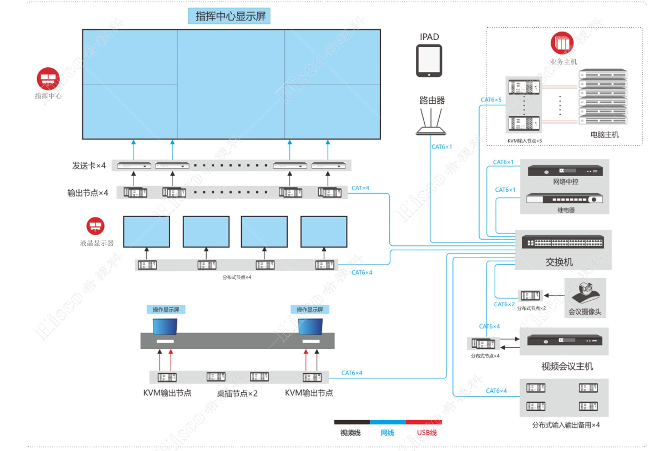 3.业务办公电脑、领导指挥电脑、多媒体插座设备等视频输入源通过分布式节点连接到分布式可视化管控系统,实现各类视频信号的输入;