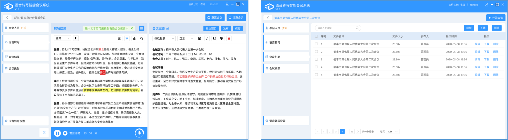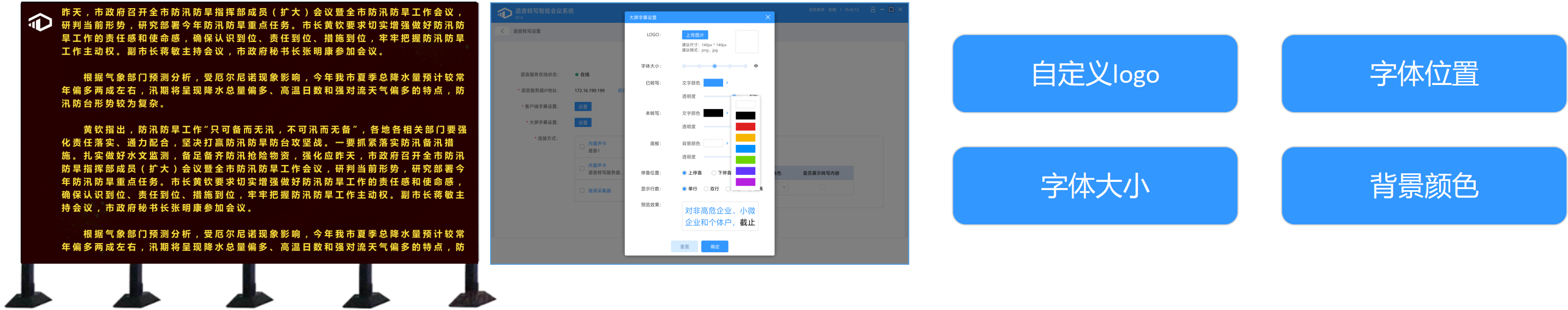 角色分离:实现在会议过程中对会议的发起方、参与方、主席、主持人、秘书等将各方发言的内容进行角色分离并自动实时识别成文字,并把语音转写成的文本以字幕的形式投放到大屏显示。