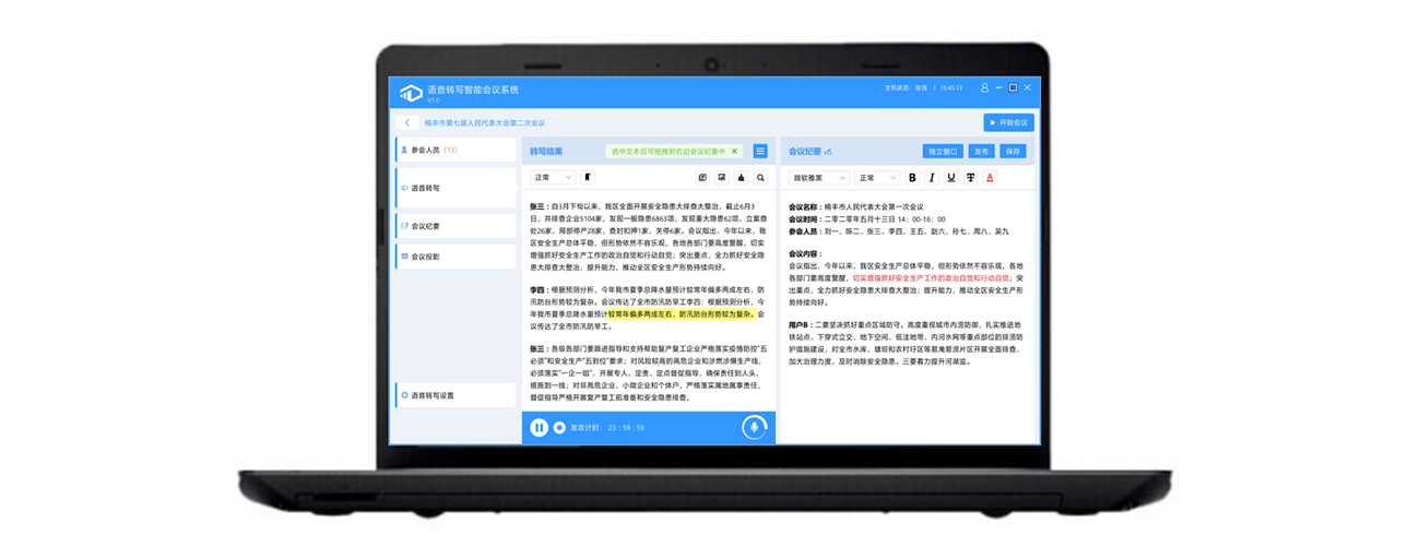 展板展示转写结果:语音转写展板展示语音转写文本内容,可对展板字体进行放大缩小和重点标记。自动同步展板纪要内容,实时展示语音转写文本。